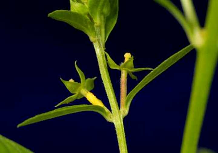がくの下にのびている棒状のものが子房です。 茎は稜があるので角ばって見えます。写真のように四角柱になることもあります。 アカバナ科は、葉のつき方は基本的には互生です。しかし、写真のように対生になる場合もあるのです。 何事も決めてかかるのはよくありません。 図鑑をうのみにしないで、自分の目を信じましょう。 |
