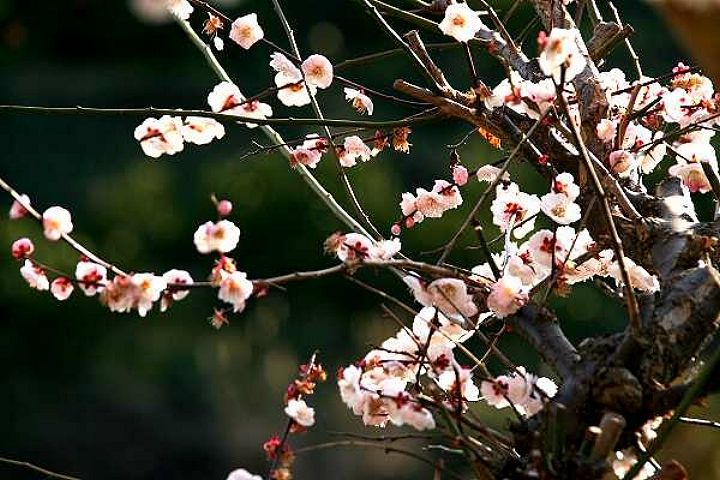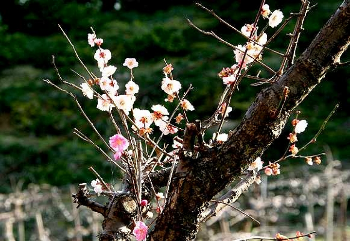 バラの花は、もともとは5枚の花弁なのですが、品種改良が盛んに行われ、多くの花弁をもつものがあります。 写真のウメも、花弁が多い種類です。 ウメは、枝が茂りやすく、まめに剪定をしないと、すぐにボサボサになってしまいます。 |
