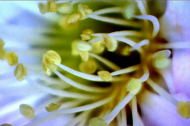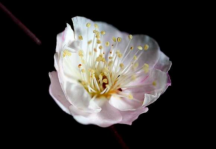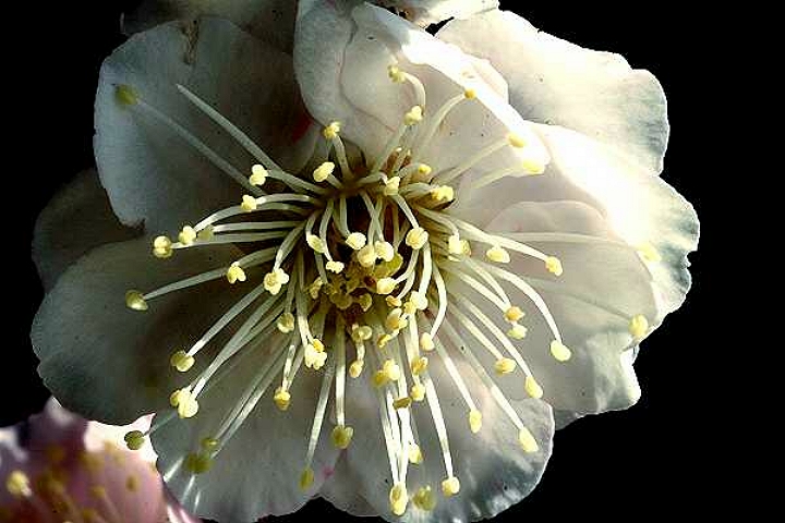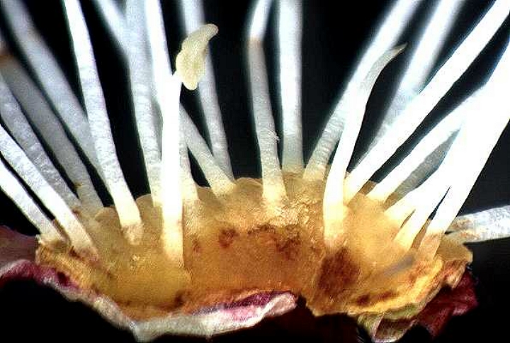 おしべのつけ根が気になります。 黄色っぽいところは ウメやモモは、子房がふくらんで果実になり、そこを食べますが、リンゴやナシなどは、花床が子房を包み込んで、花床がふくらみ、そこを食べることになります。 同じバラ科でも、果肉に発達する部分が異なります。 |