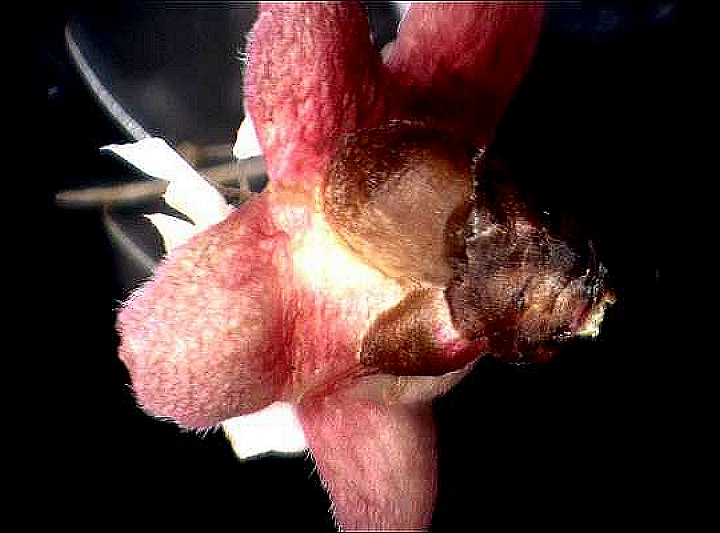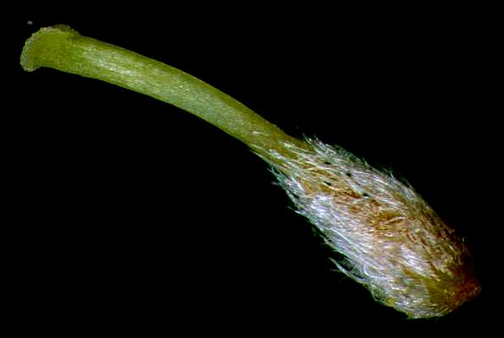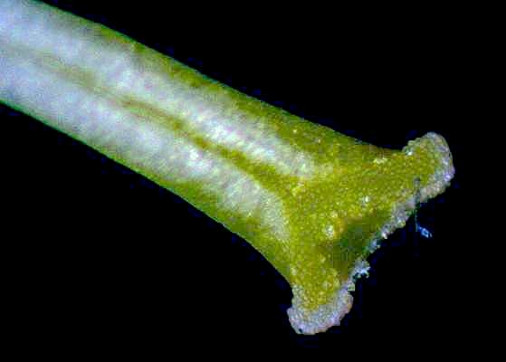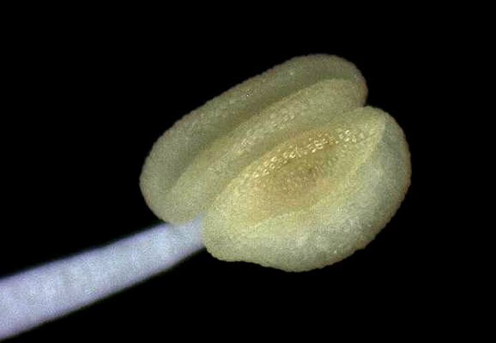 葯を裏から見てみます。 2つの葯室がつながっている部分を そこに花糸の先端がついています。 葯隔は、花糸の先端が変化したものだといえます。 |