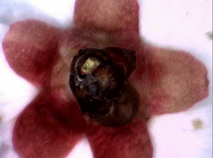 柱頭は、花粉を受けるところです。 ここから粘液が出て花粉をとらえます。 表面がデコボコの ウメの柱頭の形はわかりにくいので、いろいろな角度から観察します。 |
