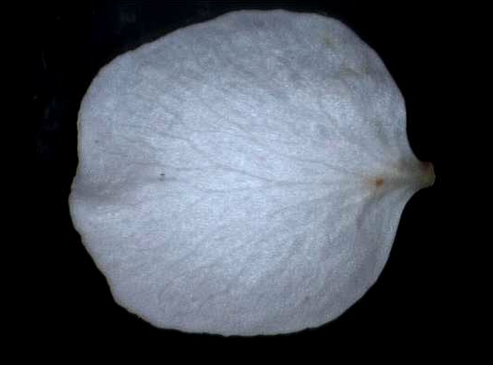 1枚の花弁を観察します。 葉脈のようなすじを見ることができます。 葉脈と同じように、このすじは水を通す管になっています。 花弁も花葉から進化したことがわかります。 このすじの中に水が行きわたることによって花弁が開くのです。 動物でいうと、昆虫のチョウの羽も同じことがいえます。 さなぎから成虫になるときに、羽のすじの中を水(体液)が行きわたり、羽がぴーんと広がるのです。 |