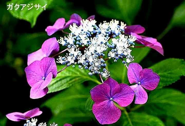アジサイ属はマンサク目ユキノシタ科、あるいは、バラ目アジサイ科に入れられることが多いですが、APGではミズキ目アジサイ科になっています。ミズキ目はキク類だから、バラ類とはかけはなれた分類になっています。 名前のいわれは、外側の大きな花を ふだん目にするアジサイには、左のガクアジサイと下のアジサイがあります。 |