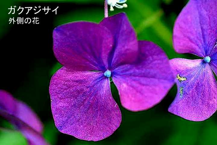 ガクアジサイの外側の大きな花です。 がく片が、大きな花弁状に変化しています。 がく片は、4〜5枚あります。 色が緑色なら、葉のように見えることでしょう。 がくも、シュートの葉が変化したものであるということを 中央の |