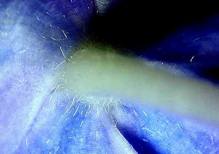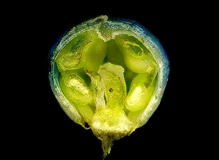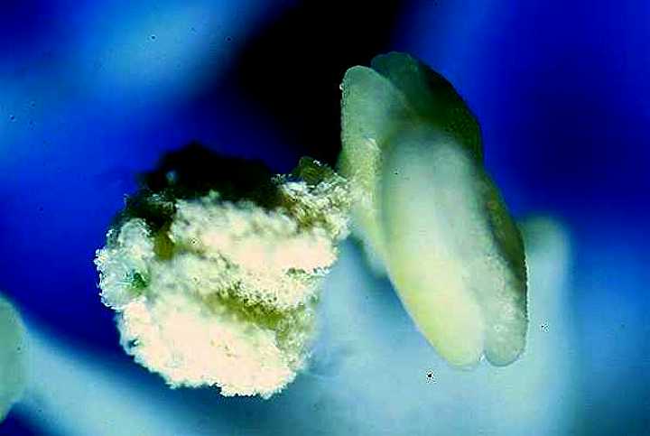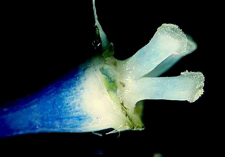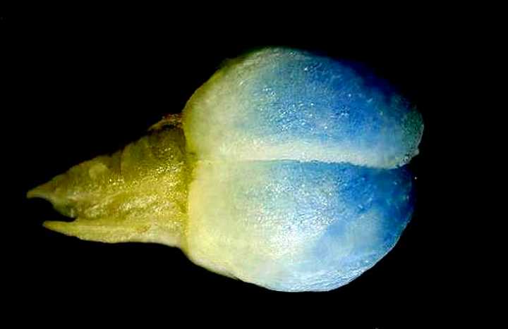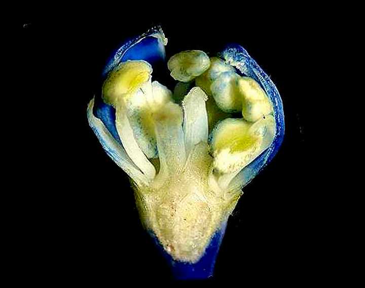 がく片をはがし、中央の青いつぼみを取りだします。 4〜5枚の青い 中はどのようになっているのでしょうか。 |