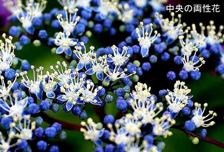 たてに切ってみました。 ほとんどの図鑑には、外側の花を装飾花と呼び、生殖能力をもたないと書いてあります。 中を調べてみると、中央にめしべ、まわりにおしべが、ぎっしりと ただ、このまま成長しないので、種子をつくることはないのです。 |