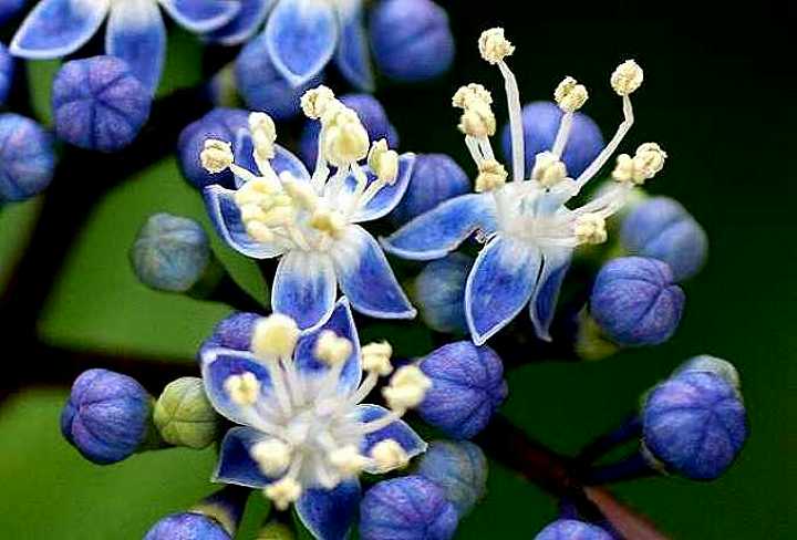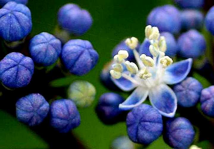 集合花としてのガクアジサイもきれいですが、双眼実体顕微鏡で見た1つ1つの花も非常に美しい。 アジサイにはない美しさです。 4〜5枚の花弁が後ろに 中央に3〜4個の おしべは10本あります。 |