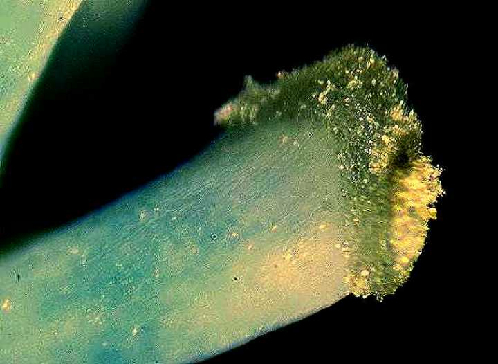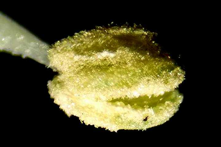何か変わったところというのは、これです。 完全に開いた葯とまったく開いてない葯が同時にあります。 これはよくあることです。 葯の開く時期をずらして受粉する期間を長くすることです。 |