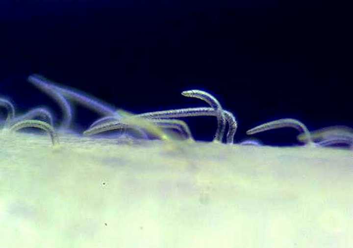 毛を顕微鏡で拡大してみます。 毛の生えている植物は、たくさんあります。 毛のはたらきは、いくつか考えられます。 たぶん、最も多いのは、害虫よけでしょう。 |