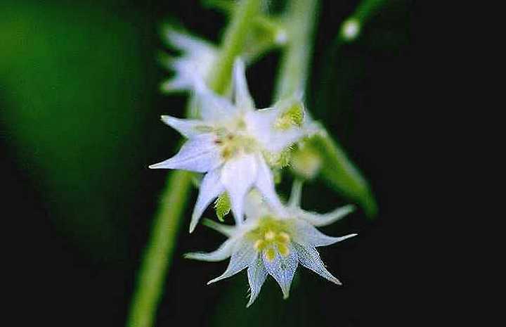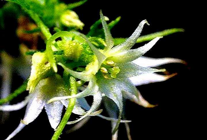 葉の形が、たいへん変わっています。 茎にもはえていますね。 横下の方に小さなツメがあり、下の方には大きなツメがあります。 このツメは、いったい何なのでしょう。 |