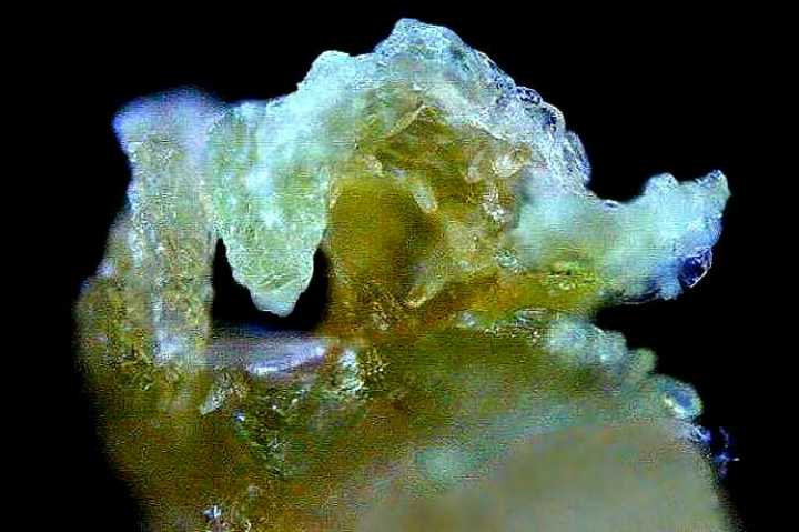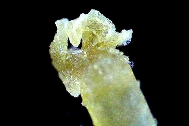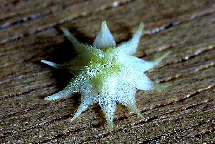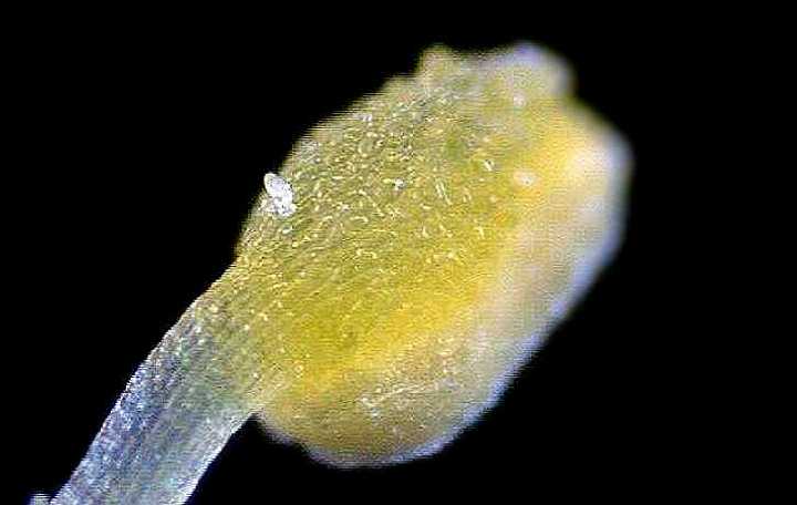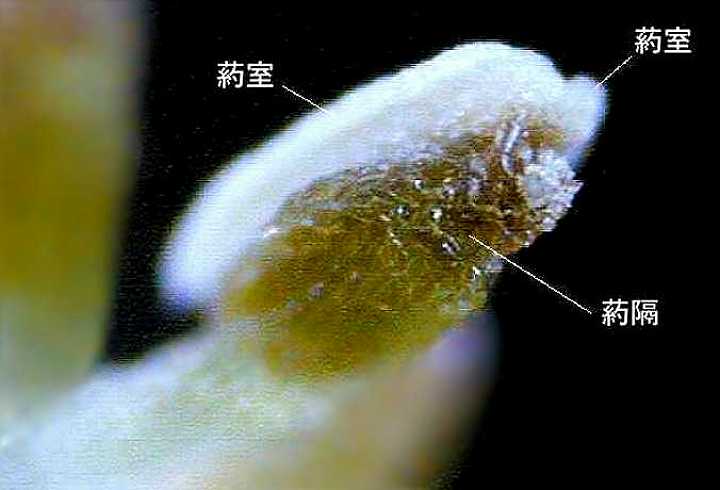 ゴキヅルの葯は、ちょっと変わっています。 右の写真の白いところが葯室で、茶色っぽいところが葯隔です。 ふつう、葯隔をはさんで2つの葯室がついているのですが、ゴキヅルの場合は、葯隔の上に2つの葯室がならんでのっかっているといった方がわかりやすいでしょうね。 |