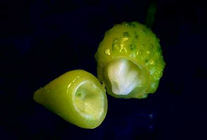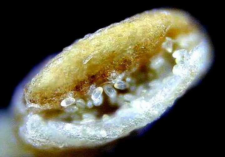 果実が これがだんだん茶色に変わって、種子になっていくのです。 胚珠の数は、1個に見えますが、本当は2個なのです。もう1個は、小さくてふたの内側にはりついていました。 このように、ふたがあるような果実をがい果といいます。 |