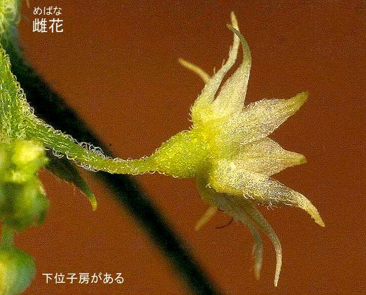 つぎに 雌花も 5枚の花弁も5枚のがく片も、基部でつながっていることについては同じです。 花冠の内側から こういう子房を下位子房といいます。 位置でいうと、子房下位です。 |