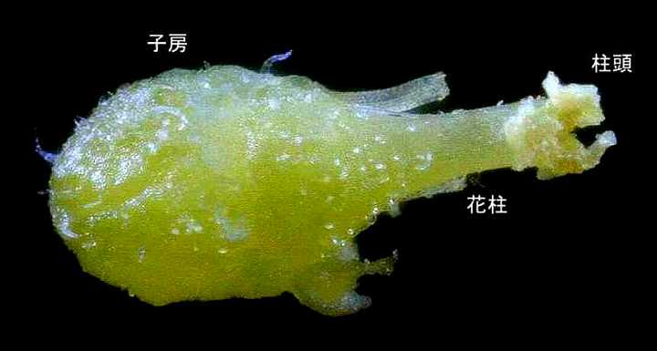 横からアップで見て見ると ドングリに似ています。 輪の線は、2つの部分の この境目は、がく片や花弁が出ていたところです。だから、子房 ただ、先の部分は、はじめ小さく、しだいに大きくなっていきます。はじめのころは、子房の大部分が |