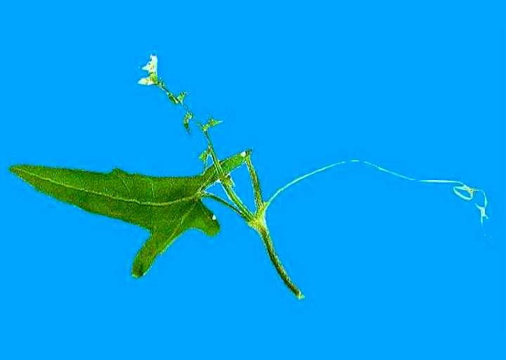 また、葉と こう見ると、対生している片方の葉がヒゲに変化したと考えられます。 対生している葉がヒゲに変わってしまったのですから、葉のつきかたは、ほんとうは対生だけれど、いちおう互生ということにしておきましょう。 ヒゲの先端は、2つに分かれることがあります。(分かれないのもあります) |