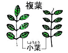 ふつう私たちが考える葉は、左の単葉です。複葉というのは、本来1枚の葉であるものが進化(変化)して数枚の葉に分かれたものをいいます。