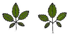 左の2つの葉はよく似ているでしょう。ところが、よくみると、下の2枚の小さい葉のつき方がちがうのです。