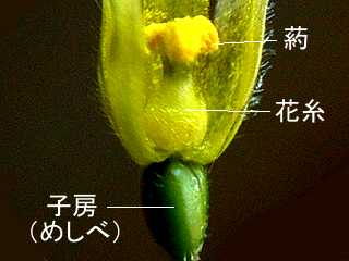 オオニワゼキショウのおしべは花冠の中に3個の葯が見えます。 花冠の中をたてから見るとおしべの全容を見ることができます。 子房は花冠より下だから子房の位置は子房下位です。 |