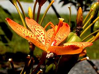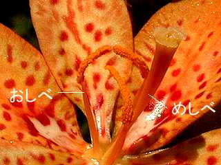 ヒオウギのおしべも3本がはっきり確認できます。 シャガなどアヤメ属のおしべは外花被と花被化した雌しべにはさまれているので、外花被を取り除かないと見ることはできません。 |