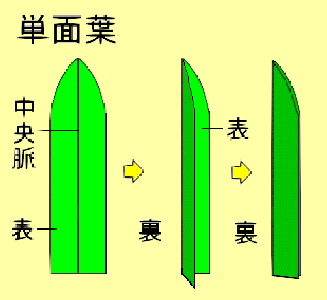 シャガの葉は、細長い1枚の葉が中央脈を谷にして内側に折りたたまれたものなのです。 だから、表面に出ている面は、すべて |