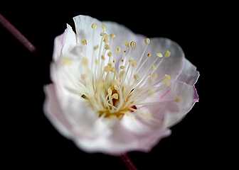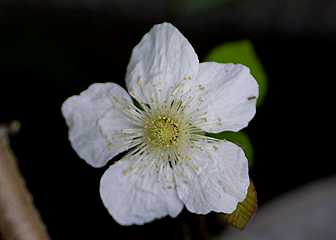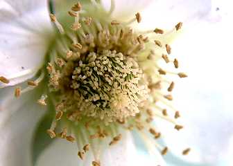 中央の丸いかたまりがめしべの集合体です。 丸い花托の上に多数のめしべがつき、このような形になります。 まわりのひょろ長いのはおしべです。 |