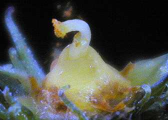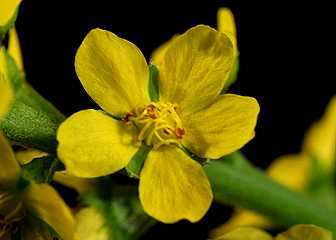 観察しやすいようにおしべとがくを取り除きます。 キンミズヒキは心皮を2個もちます。 子房から短い花柱を2個出し、そのうち成熟するめしべはふつう1個だけです。 |