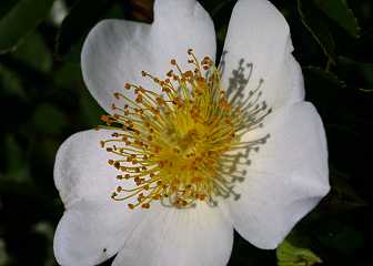 1本のめしべに見えますが、バラのめしべは、ちょっと特殊です。 少しかたい花床筒の中にいくつものめしべ(子房)が入っています。それぞれの子房から出た花柱がとちゅうで合生し1本になってつきでてきます。 |