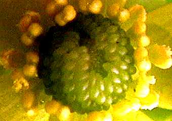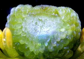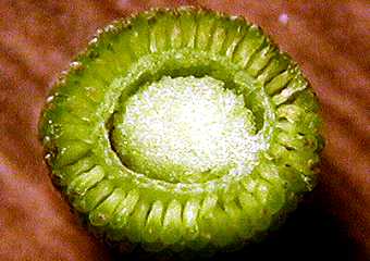 緑色の粒々がすべてめしべです。非常に多くのめしべが集まって球形のかたまりになっています。 1つぶ1つぶのめしべが熟して果実になります。 |