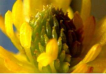 スイレンなどの原始的双子葉植物から単子葉植物が生まれ、原始的双子葉植物はさらに真双子葉植物へと進化を進めていきました。キンポウゲ科はその初期の真双子葉植物です。 | 花は葉から進化したもので、その葉のことを花葉といいます。 原始的双子葉植物は花被が葉のようにたくさんついています。真双子葉植物はその数が整理されてくるのです。 |