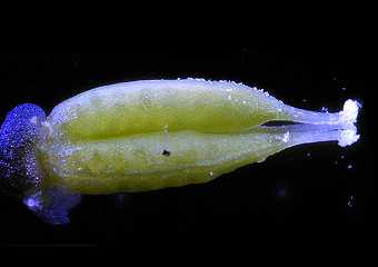タガラシの花被を観察します。 花被の基部にもり上がったところがあります。これは、きわめて小さなりん片なのです。ルーペでも、ちょっと気づかないほど小さなものです。 りん片にかこまれたところを U字形のりん片と蜜腺を確認できました。 |