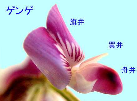 また、1本のおしべだけは合成せず、なかまはずれになっています。 この1本のおしべと他のおしべのすき間を、 マメ科の中には、クズのように10本が全部合生しているものもあります。 |
