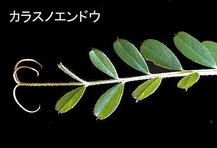 鳥の羽のような感じがするので羽状複葉といいます。 カラスノエンドウは先端の小葉がひげに変化しています。 |