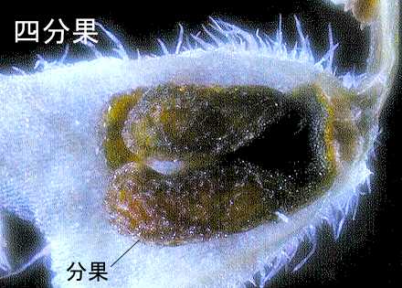 ガクが果実を包みこみ、果実は4個に分かれる。分果の中には1個の種子ができる。 | |