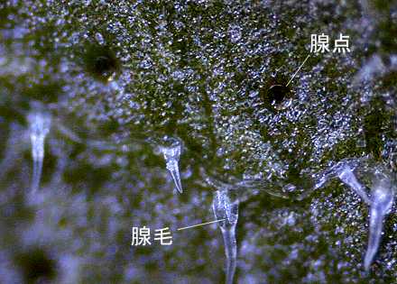 葉には精油があり芳香を出す。 葉の裏には精油を出す腺点が多数ある。 |