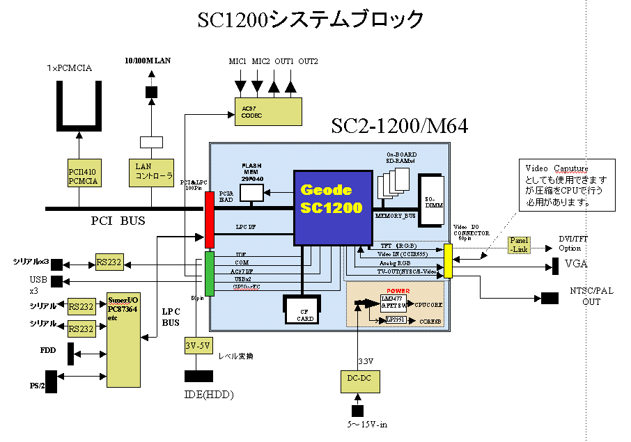 SCシリ-ズはCPUに多くの機能が集積されているので外部は簡単な回路で動かすことができます。 下の例はピノーのPNMシリーズを用いて外部にLAN、PCMCIA、Audio, レガシ関連のI/O増設をした時の構成です。 PCIバス上にLAN.、PCMCIAを接続、 LPCバスにはSuperI/O, AC97リンクにオーディオコ-ディックを接続しています。電源は3.3Vで動くので簡単なDCDCのみです。 この構成で消費電力は5W程度です。 順次詳細を公開して行きます。
