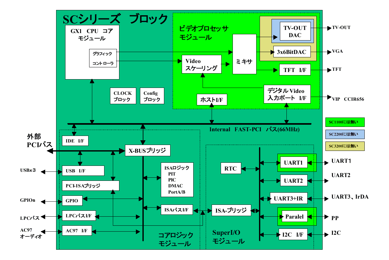 SCシリーズはCPUがGX1コアですので性能はGX1とほぼ同じです。実際にパフォーマンスを測定するとシステム性能では5%程高くなります。 PCIバスを使わずにサウスブリッジが接続された効果と考えられます。 内部のPCIバスは66MHzで動いており、このバス上にサウスブリッジ、ビデオプロセッサー、IDEコントローラが接続されています。外部PCIバスはクロックを落としてもCPU内部のPCIバスに影響を及ぼさないためにPCI−PCIブリッジで接続しています。 バスに関してユニークなのは、PCIバスとISAバスがマルチプレクスされていることです。 SUB-ISAとはいえ、シングルチップでPCIとISAをサポートできることはシステムの構築には大きなメリットがあります。 内部にはFDDとPS2を除くほとんどPC機能が集積されており、システムの仕様とCPUの内部構造、制限事項を熟知していれば、きわめてシンプルな構成で色々な装置に組み込むことができます。 ビデオプロセッサーはCCIR656に対応したデジタルビデオキャプチャ回路、スケーラ、ミキサー、アルファブレンディング回路、Video-DAC、TFTインターフェースで構成されています。 これらの機能はデジタルTVやVideo−ON−Demando用のセットトップBOXに使用されます。 SCシリーズを用いた汎用のボードはあまり見かけませんが、小型のモジュールの形で、数社が製品化しています。 いずれも開発にノウハウの必要なCPU周辺とメモリーインターフェース、BIOSが搭載されています。これだけ集積化されていると、外部に簡単な回路を接続するだけで動きますが、その分、BIOSなど、動作条件の設定にかなりのノウハウが必要のようです。