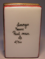 リモージュボックスを飾っているキュリオケース。 リモージュボックスファンにはたまりません! 飾られているリモージュは よく見かけるお馴染みのものですよね。 バックの色はリモージュ特有のブルー。 中のリモージュを引き立てています。 Limoges France Peint main LS 2/500 5×3×7cm |