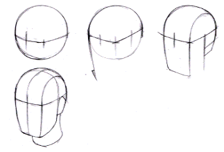 ま横の描き方を理解したらすこし角度をかえてみようね。まず左の絵をみてね。人の顔を箱でかっちりとらえた物だよ。こうゆうふうに考えたらわかりやすいでしょ。このイメージをふまえてすすめてね。