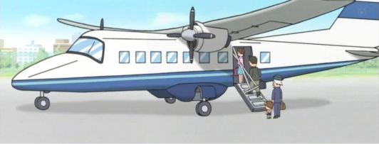 この飛行機は新中央航空のドルニエ228-212(乗客19人、乗員2名)でした。 プロペラの高翼機ってかっこいいですよね。 一度乗ってみたいです。 空港に着いた直後に離陸してしまったので、写真は撮れませんでした。 アニメでは、飛行機だけデジタル作画になっていたように見えました。 |