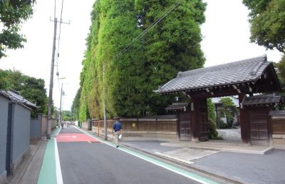 そしてこの通りの画像は烏山寺町のメインストリートである「寺院通り」、常栄寺前と完全に一致です。 常栄寺の背の高い並木がすばらしいです。 通りの緑色の歩道表示まで、ちゃんと描かれています。 両側にずっとお寺が並んでいて、ふしぎな雰囲気のある通りです。 休日に訪れましたが、観光客やハイカーはほとんどいない様子でした。 |