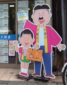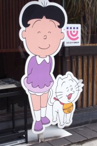 一応、自宅のある設定の世田谷区桜新町も行ってきました。 東急線桜新町駅から長谷川町子美術館までが「サザエさん通り」になっていて、サザエさんのキャラクターで彩られているのですが、基本は原作マンガの絵です。 その中で、いろいろな店の店頭に飾られている等身大パネルが、アニメ絵柄でした。
