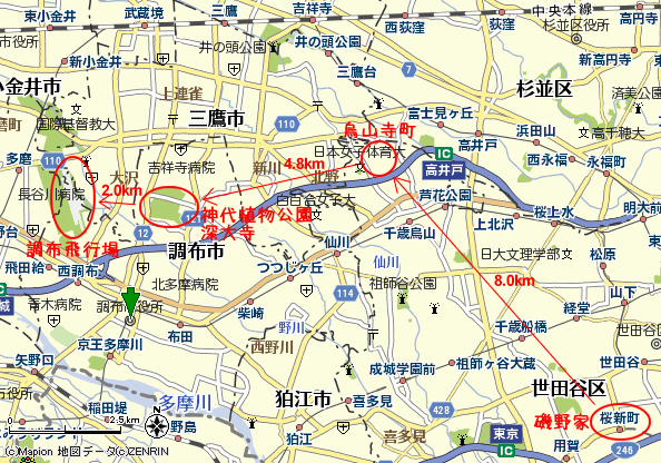 磯野家のある「あさひが丘」は、現在「長谷川町子美術館」のある世田谷区の桜新町周辺という設定らしいです。 終点の調布飛行場まで15km、右の地図に示した距離は直線距離なので、実際に歩くともっと長い距離となってしまいます。 自分も歩いて追いかけてみたかったのですが、さすがに時間がかかりすぎるので、電車やバスを使っています。 それでも、ちょうど電車の走っていないところなので、結構移動が大変でした。