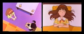 まず、この92話最大の名場面は、あずきの部屋であずきとヨーコが正対する、このシーンだと思います。真上から見る風変わりな視点のうえに、回転しながらズームアウトする独特なカメラワークで、あずきとヨーコの間の緊張感を非常にうまく表現していると思います。 シリーズを通しても、屈指の名場面です。 片渕氏はカメラワークを売りにしているようなので、その実力が発揮されたシーンと言えるでしょう。
