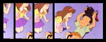 アニメーションもムチャクチャ枚数使っているとか、派手な動きをさせているわけではないようですが、他の回よりよく動いているのではないでしょうか。 このヨーコちゃんがひざをついてかがみこむシーン、1コマずつ並べてみました。短いシーンで、しかも端っこギリギリですが、スカートなどは『あずきちゃん』らしからぬ動きではないかと思います。