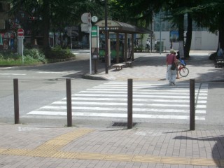 106話にも花の門が出てきます。 この話で、かおるちゃんがお父さんを駅まで追いかけていった、この駅前の横断歩道は右の写真の阿佐ヶ谷駅南口駅前と思われます。 ロータリーになっていて横断歩道が手前と奥に二つに分かれていること、盲人用タイルの配置など、かなりよく似ています。 |