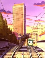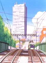 都電の進行方向にサンシャイン60が見える場所は2ヶ所あります。 1ヶ所が庚申塚から巣鴨新田の間、もう1ヶ所がこの高戸橋付近、面影橋から鬼子母神前の区間です。 手前に見えているような鉄橋があるのは高戸橋だけなので、場所がピンポイント特定できました。 路面の起伏は確かにちょっとあるのですが、アニメではかなり強調されています。 それ以外はそっくりに描かれていると言っていいでしょう。 これも現地に行って実物を見ると感動してしまう風景です。 |