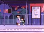 左は89話で、同窓会に出席する父に同行してきたあずきを、おじいちゃんが迎えに来ている場面です。 右の写真は、同じホームに立って早稲田方面から来る電車を見たものです。 線路の曲がり方は似ていますが、周辺の雰囲気はかなり違いました。 実際には低層ビルやマンションが立ち並び、かなり雑然とした東京の雰囲気です。 アニメのような住宅地は、ちょっと理想化された昭和40年代の住宅街でしょうか? |