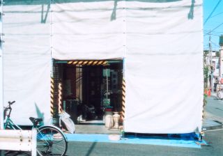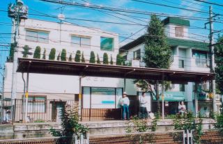 左の画像は忘れ物を探しに来た都電の営業所ですが、これもそっくりそのまま実在しました。 ご苦労様なことに、電話ボックスや電柱まで本物そっくりに描いてあります。 全景を入れるため斜めの写真になってしまいました。 アニメシーンと同じ写真を撮るには、焦点距離20mmくらいの画角が必要です。 |