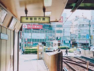 早稲田方面ホームの南口側です。 外のビルの様子もなんとなく似た雰囲気になっています。 ここの踏切は警報機も遮断機もないのですが、ケータイを見ながら電車の直前に突っ込む人が多く、傍から見てちょっとハラハラします。 |