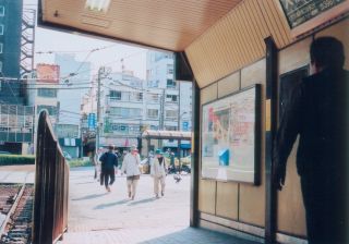 大塚駅前停留所です。 ここはJR駅に隣接して屋根のある駅舎になっていて、ホームも2台の電車が止まれる普通より長い長さで、かつ向かい合っているという具合に、特別な造りになっています。 また、JR駅の北口と南口を結ぶ歩行者用通路にもなっていて人通りも多く、都電荒川線の停留所で一番にぎやかなところだと思います。 標示板が人物と重なるため簡略化されていることと、時計が広告になっていること以外は、全くそのままに描かれています。 確か昔はベンチが置いてありましたが、夜間寝泊りする人が多かったためでしょうか、撤去されてしまったようです。 |